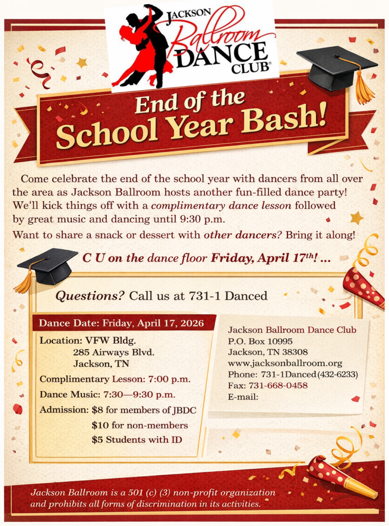 On Friday April 17th, we are going to celebrate the end of school! Come join us for a complimentary dance lesson and some snacks!